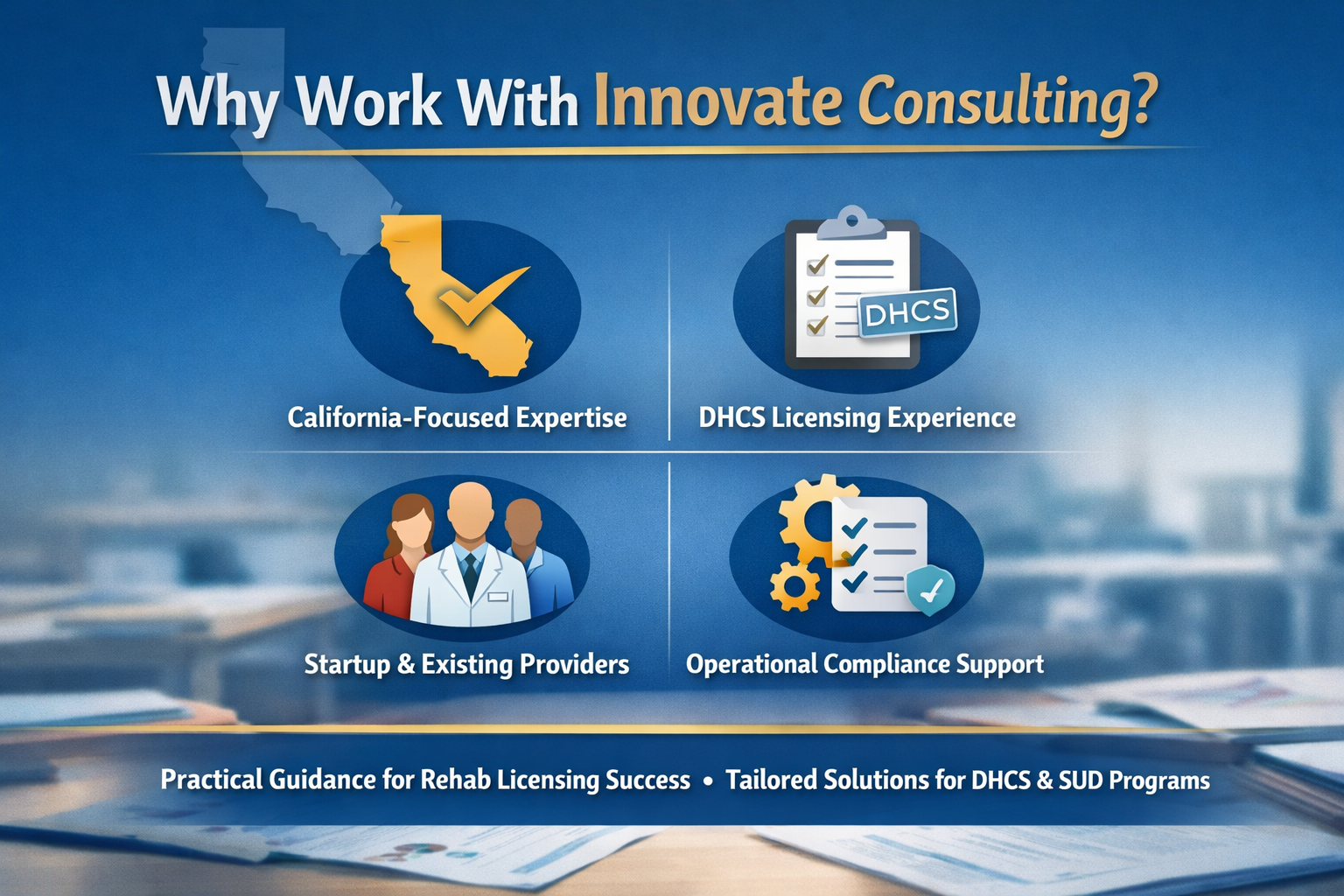 Innovate Consulting helps California providers navigate rehab licensing requirements, determine the appropriate regulatory pathway, prepare compliant documentation, and respond to deficiencies with a practical, operations-focused approach. Our goal is to help you move forward with clarity, reduce avoidable delays, and build a program that is aligned with California requirements from the start.